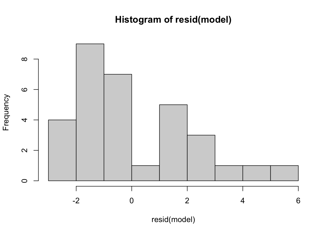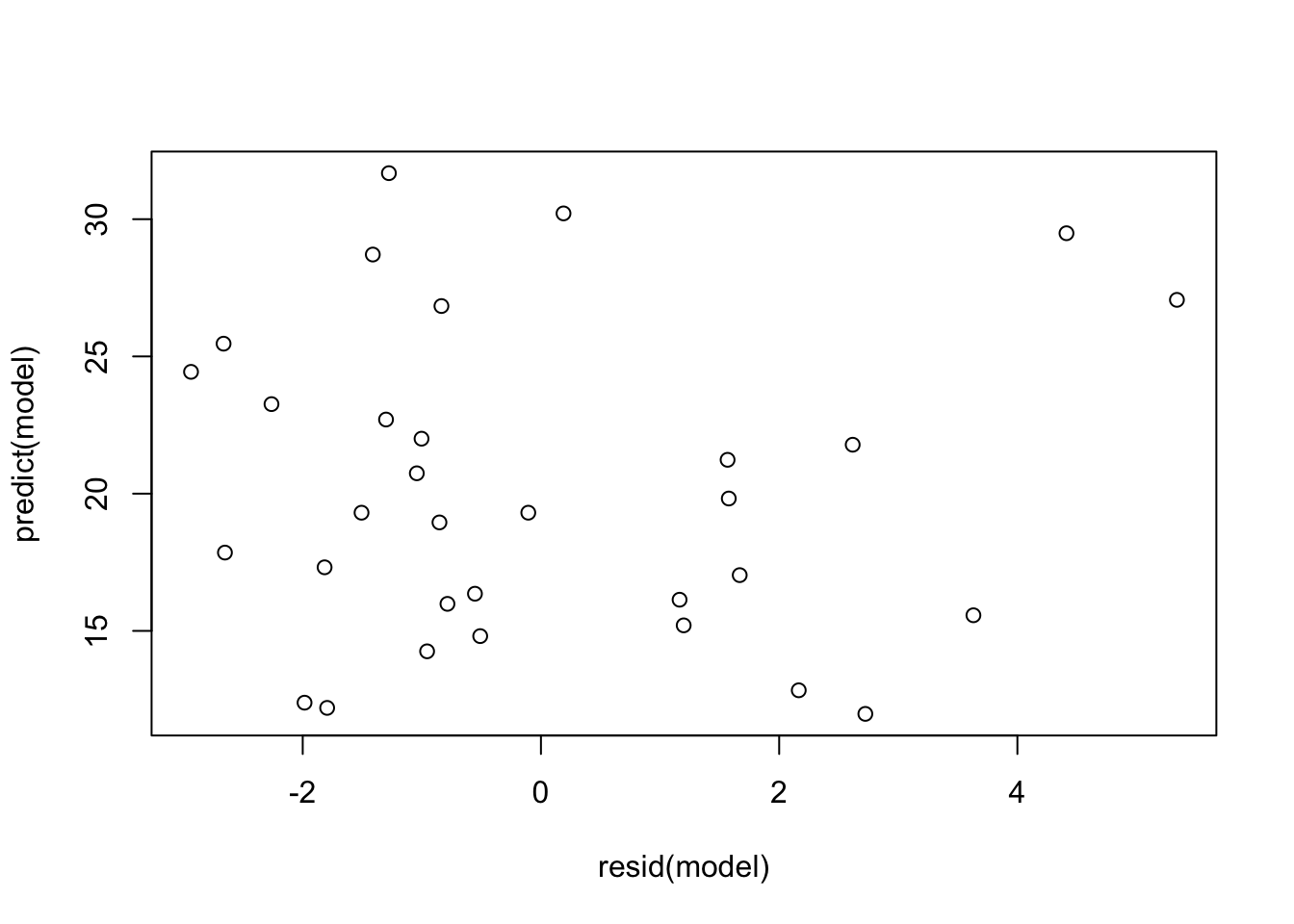 model <- lm(mpg ~ disp + hp + wt + I(wt^2) + drat, data = mtcars)- For each of the following CLM assumptions, assess whether the assumption holds. Where possible, demonstrate multiple ways of assessing an assumption. When an assumption appears violated, state what steps you would take in response.