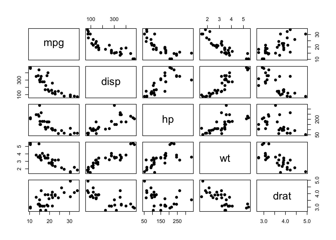 mtcarsdata, run a linear regression to find the relationship between miles per gallon (mpg) on the left-hand-side as a function of displacement (disp), gross horsepower (hp), weight (wt), and rear axle ratio (drat) on the right-hand-side. That is, fit a regression of the following form:
